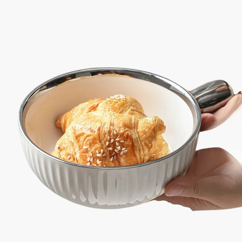 손잡이가 달린 도자기 그릇으로 편리한 사용, 내구성 강한 소재, 다양한 용도, 세련된 디자인. 주방 필수 아이템.